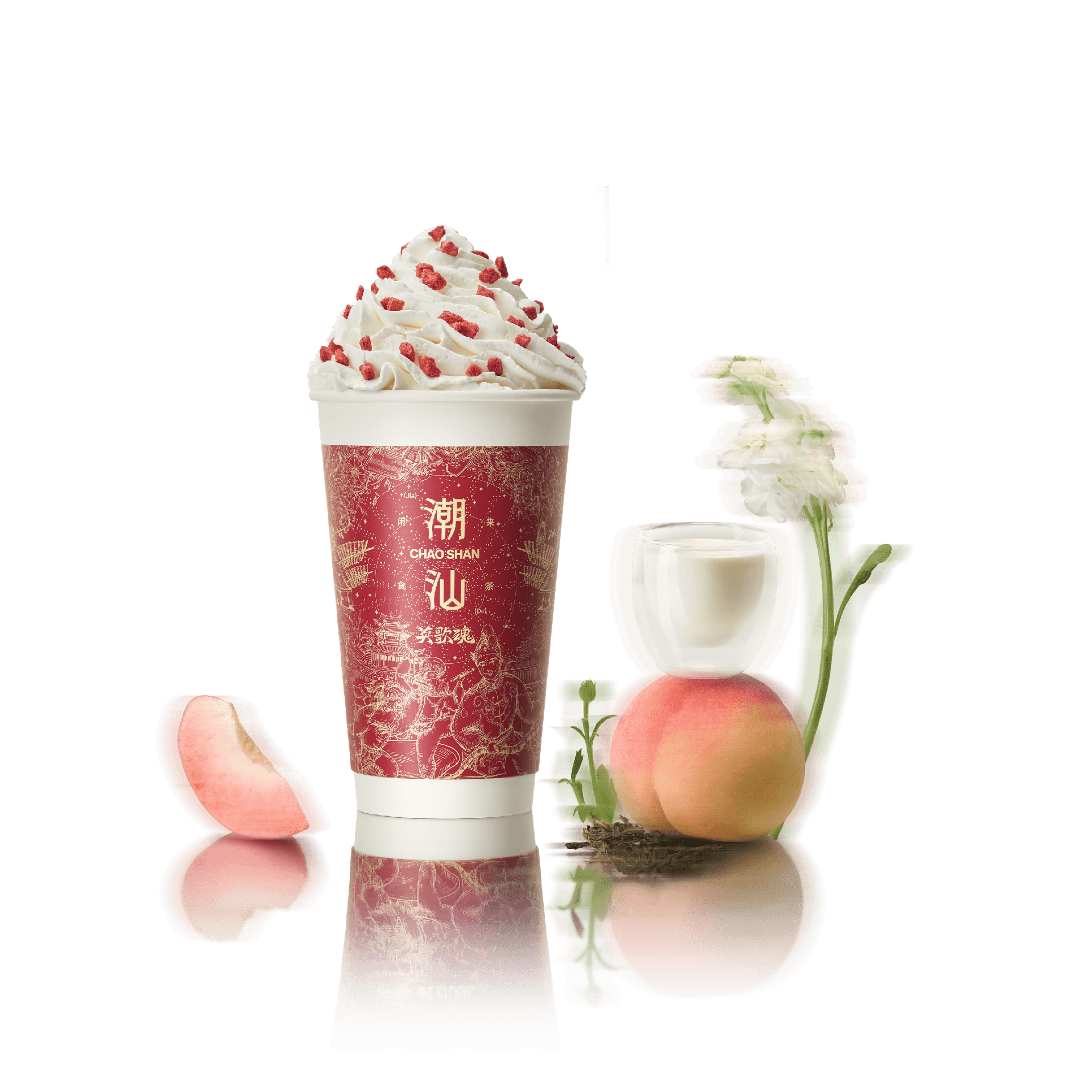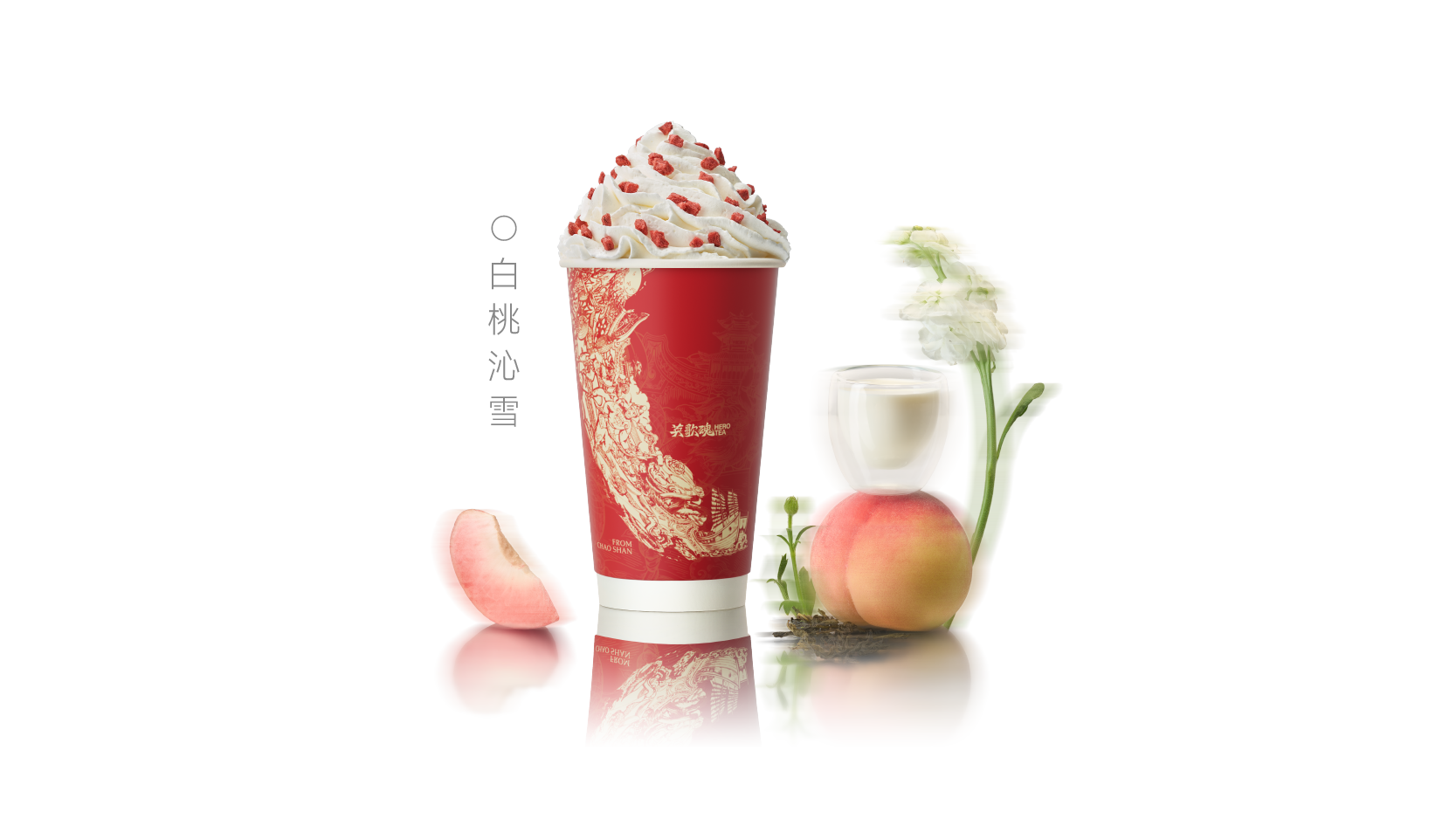 白桃乌龙邂逅牧场原生牛乳,馥郁满杯,草莓冻干雪顶细腻绵滑。
